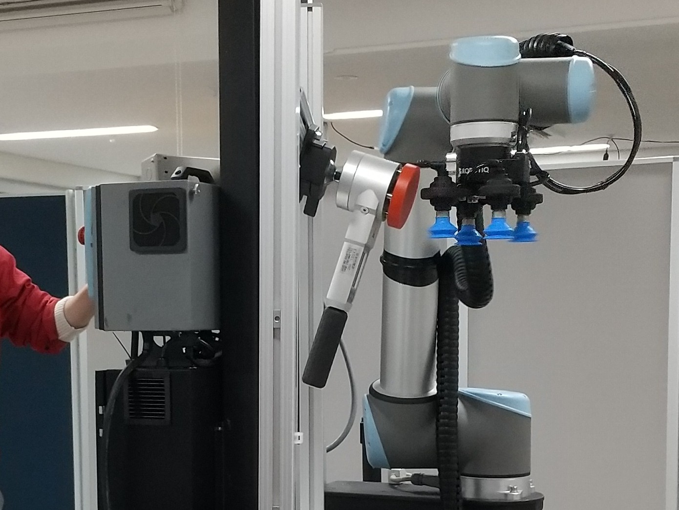 Robot Systemsafety consulting Specialist staff supports collision force measurement tests required for fence-free operation of collaborative robot systems